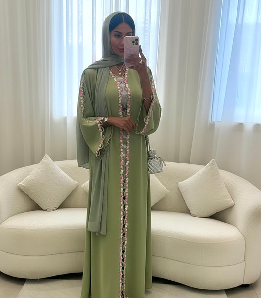 Abaya Yara à strass doré et argenté [ vert d’eau ]