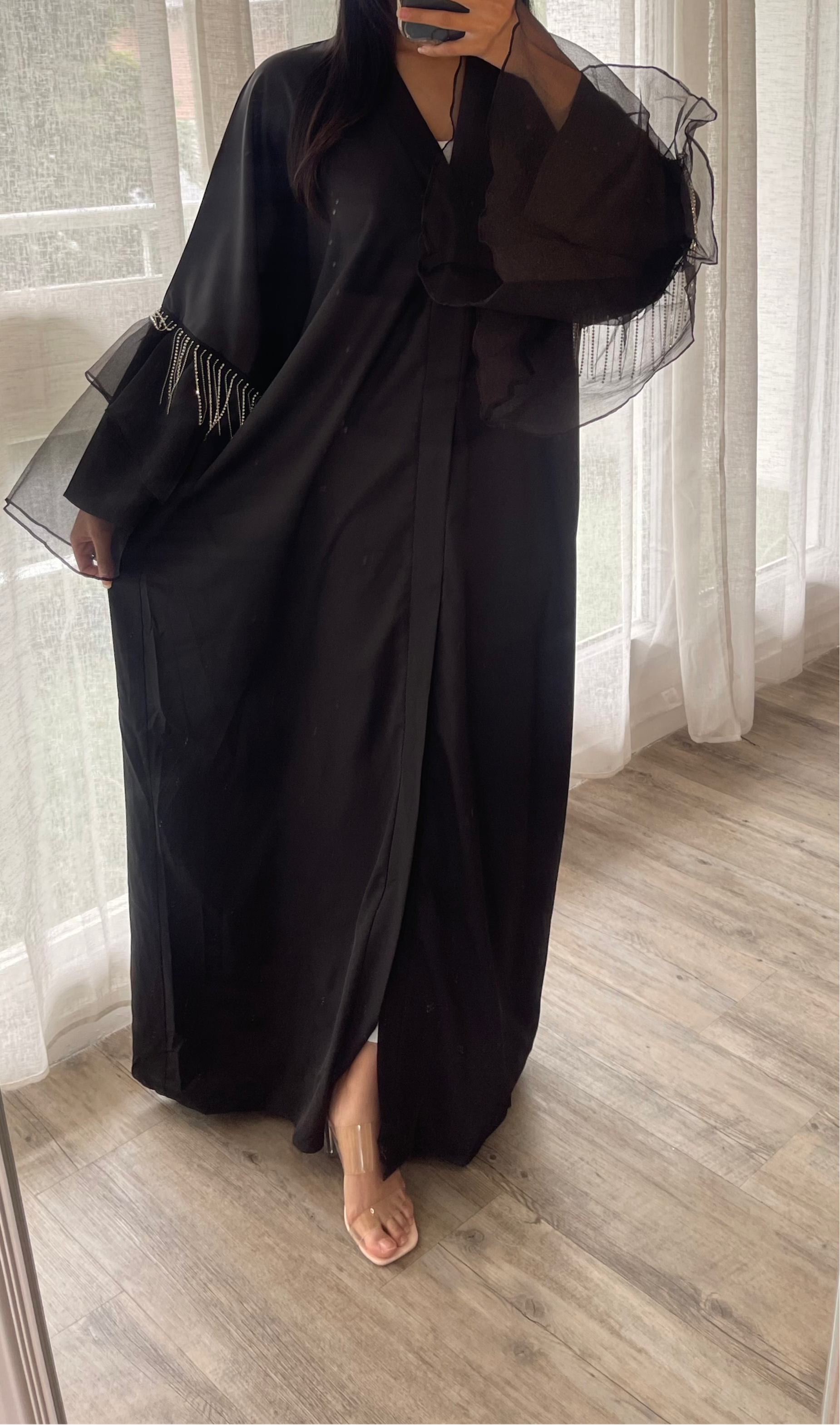 Découvrez l'élégance intemporelle avec notre abaya polyvalente. Portez-la fermée pour une allure classique ou ouverte façon kimono pour une touche moderne.