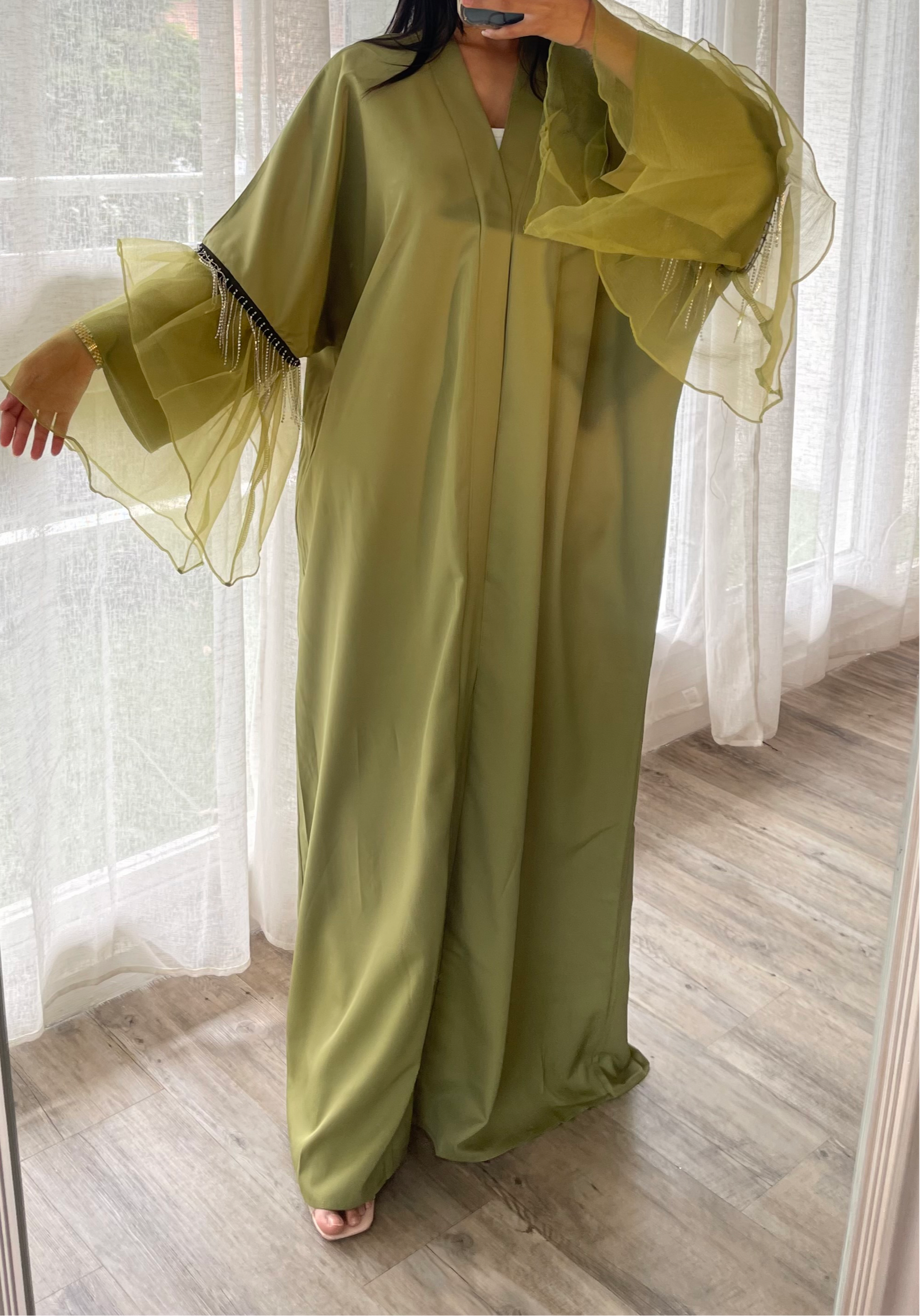 Découvrez l'élégance intemporelle avec notre abaya polyvalente. Portez-la fermée pour une allure classique ou ouverte façon kimono pour une touche moderne.