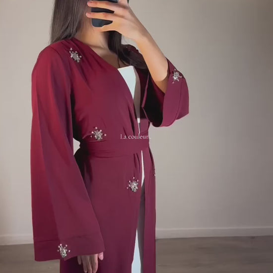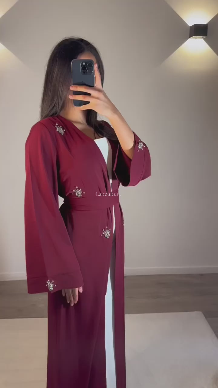 kimono à strass, une pièce unique qui brille sous la lumière. Sa ceinture ajustable met en valeur la taille, pour un look chic et élégant. Parfait pour ajouter une touche de glamour à votre tenue.